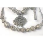 Lovely little lot of Middle Eastern white metal Bedouin style jewellery from the Yemen. Comprises substantial necklace with small bells hanging from the pendant disc. This measures 31cm across approx excluding the catches. One other similar necklace without the pendant and a stick with a number of bells attached. Interesting group of items.