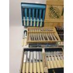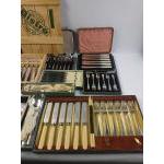 A selection of VINTAGE cased SILVER PLATE cutlery and a SILVER HANDLED cake knife to include a set of steak knives and forks by ROSTFREI and several other sets
