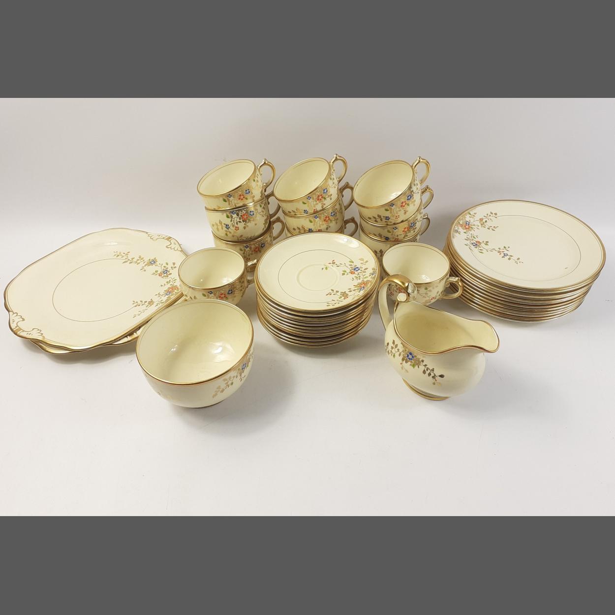 GROSVENOR CHINA, part tea service in attractive cream and floral pattern finish, to include two larger side plates 23cm approx. 11 tea cups and 12 saucers, 12 eighteen cm side plates and a sugar and cream bowl. Nice collection in good condition.