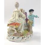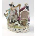 A musical porcelain grouping with Meissen-style crossed swords and incised D48 to the base. There is damage to the music stand at the back of the piece, stands approx 18cm high