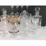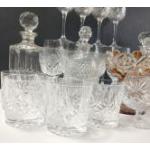 A substantial collection of crystal glassware to see you through the season comprising 5 small whisky tumblers, 4 brandy glasses, 9 tall wine glasses, 6 small wine glasses, 2 crystal decanters, 2 glass bottles with stopper and a bi-coloured bowl on a stand