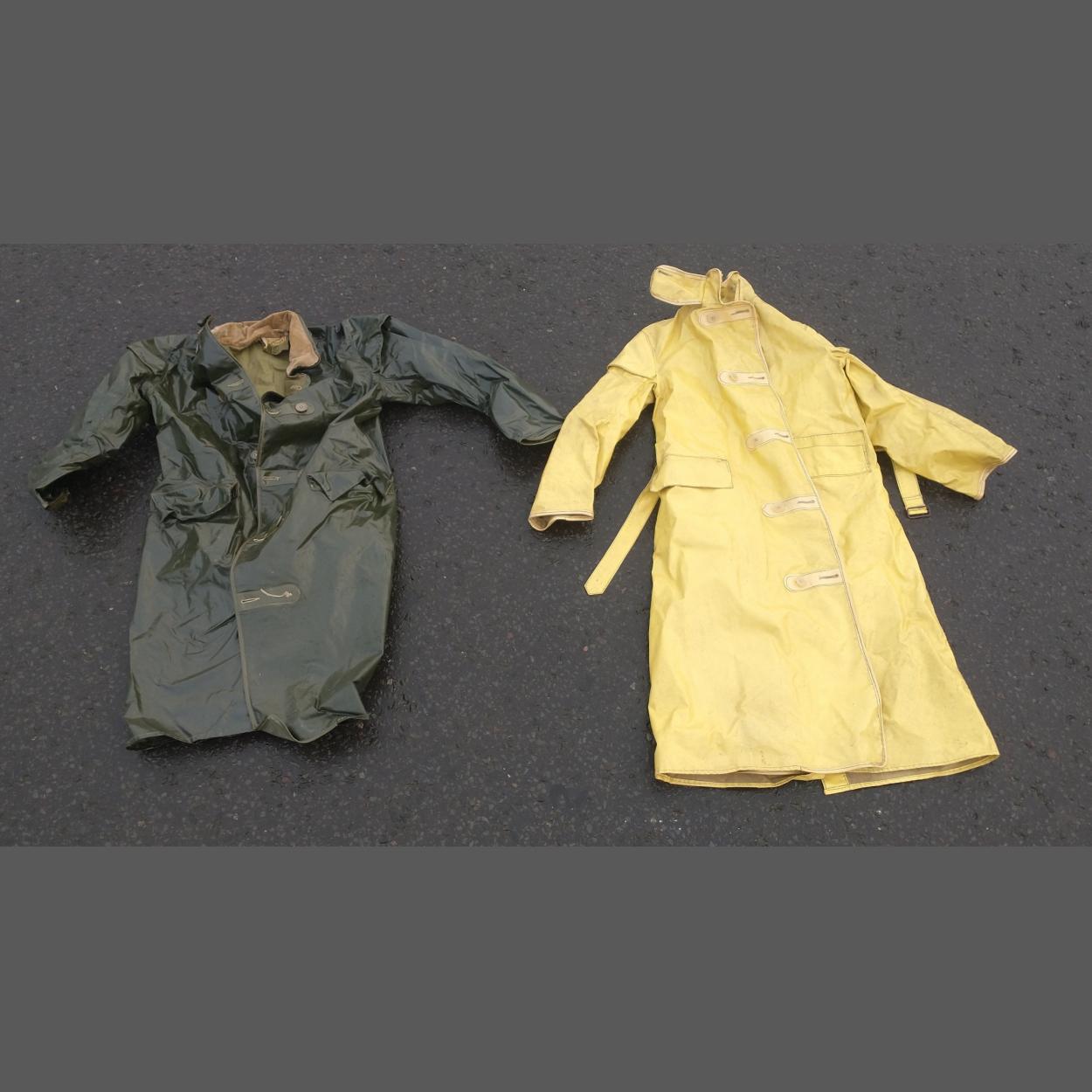 Two pairs of 70 year old 'oil-skins' makers VINCO27 made in Scotland medium sized - one in olive colours and one in mustard colour