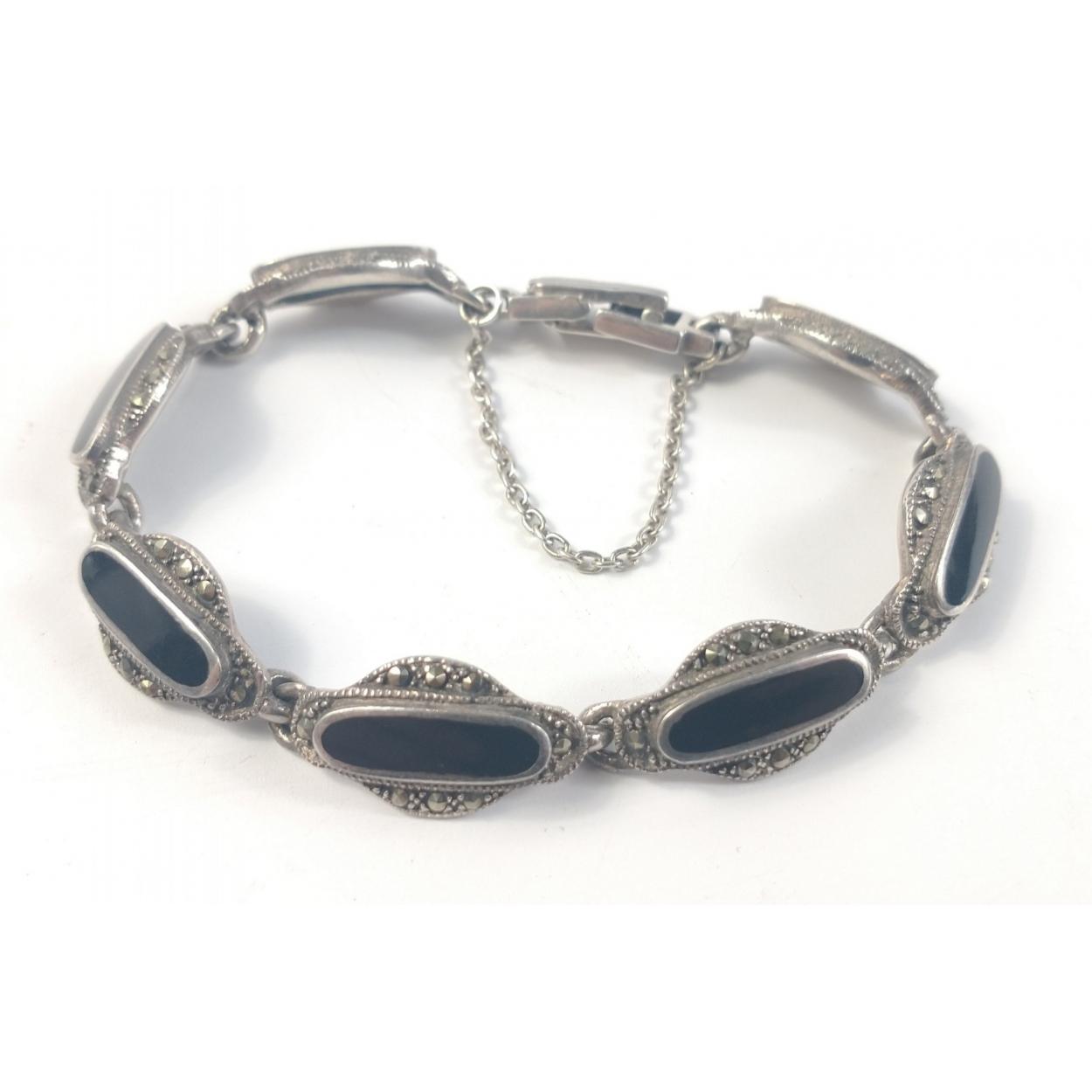 A black-jet and marcasite inspired white metal bracelet with safety chain, and comes within a nice presentation jeweller's box - would make it an ideal gift!