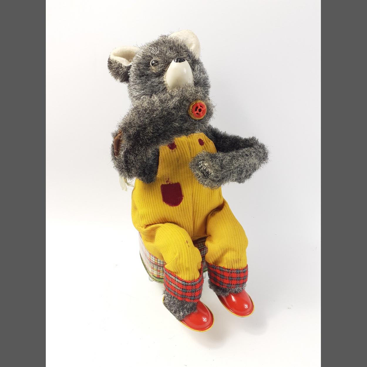ALPS Balloon blowing Bear tinplate toy. Made in Japan. Some wear and light rust spots in battery compartment but contacts appear clean. Untested. Stands 28cm tall approx. An interesting little chap.
