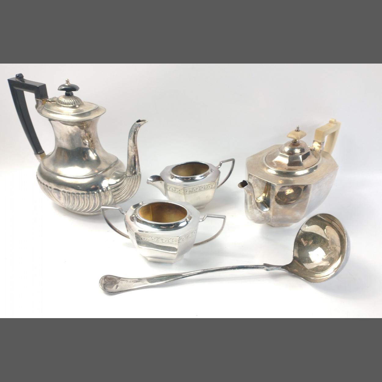 A collection of EPNS ware to include 2 teapots, a milk jug with matching sugar bowl and a Wm Rogers soup ladle (34cm long approx)