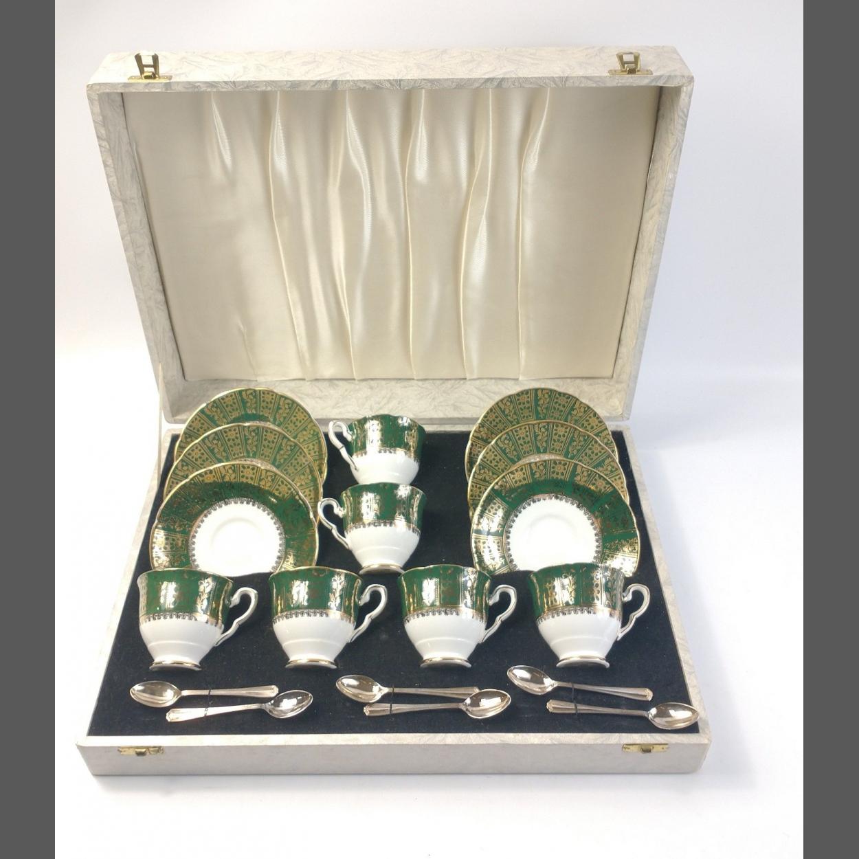 A beautiful ROYAL STAFFORD CHARTREUSE bone china six piece tea cup and saucer set in a lovely display case. Complete with six plated spoons and in perfect unused condition. This was a presentation set given to the vendors father by his employer some years ago and has been a treasured family piece.