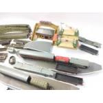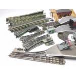 A quantity of HORNBY DUBLO rolling stock, three rail track and model railway layout buildings. Some rolling stock is tinplate and heavier gauge metal including the metal cross over bridge. An interesting collection.