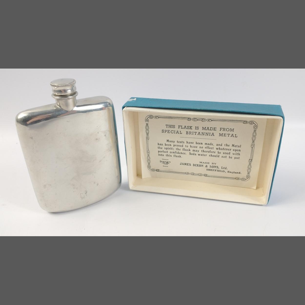 A JAMES DIXON & SONS Britannia Metal 4oz Hip flask in box with leaflet enclosed. Light marks to surface but a super complete and useable item.