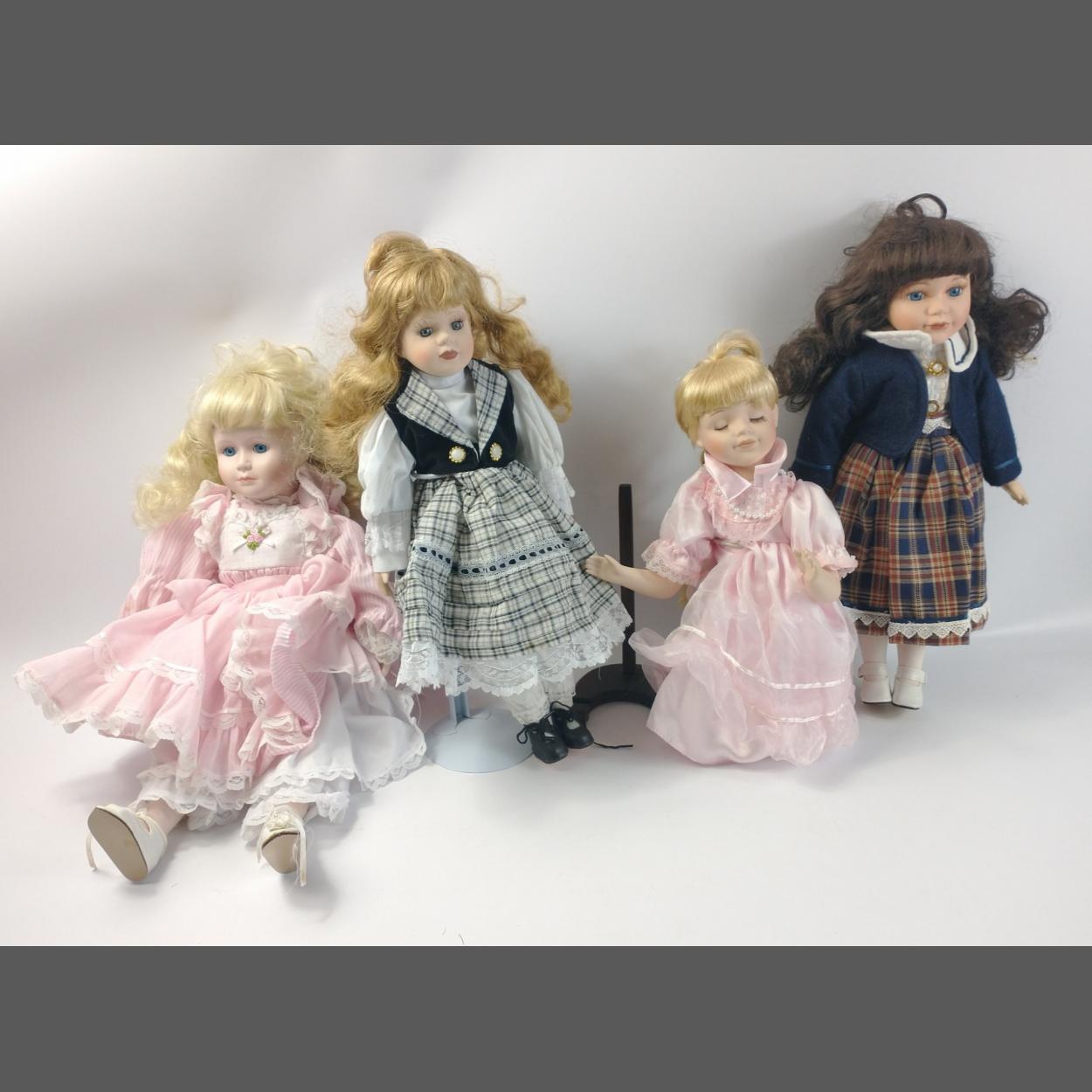 Four porcelain dolls including a Cindy M McClure (2776D) 1988 Edwin M Knowles 45cm tall approx with tag, a dark-haired beauty approx 44cm tall, a blond in black and white standing approx 43cm tall with stand, and a kneeling blond in pink satin standing 34cm tall with stand