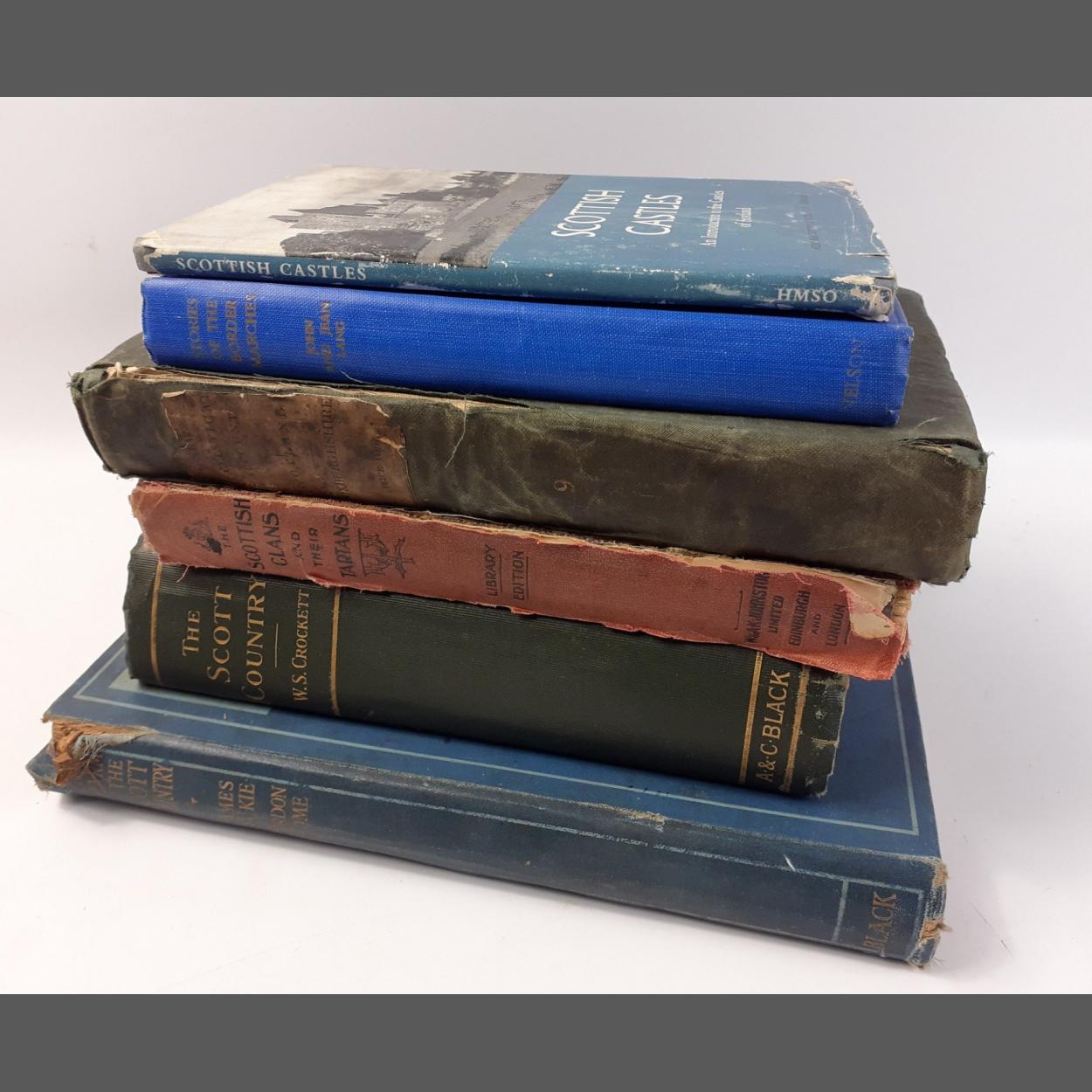 Of local interest: The Charm of the Scott Country by James Blaikie A&C Black 1927 128pp with 24 illustrations (Blank pages have been scribbled on lightly in pencil by a child), The Scott Country by WS Crockett published A&C Black 1902; The Scottish Clans and Their Tartans, library edition, published by W & AK Johnston, illustrated in colour; Stories of the Border Marches by John and Jean Lang, Scottish Castles: An Introduction to the Castles of Scotland by W Douglas Simpson, published by HM Stationery Office 1959, The Statistical Account of Scotland - Roxburghshire published by WM Blackwood & Sons 1861,