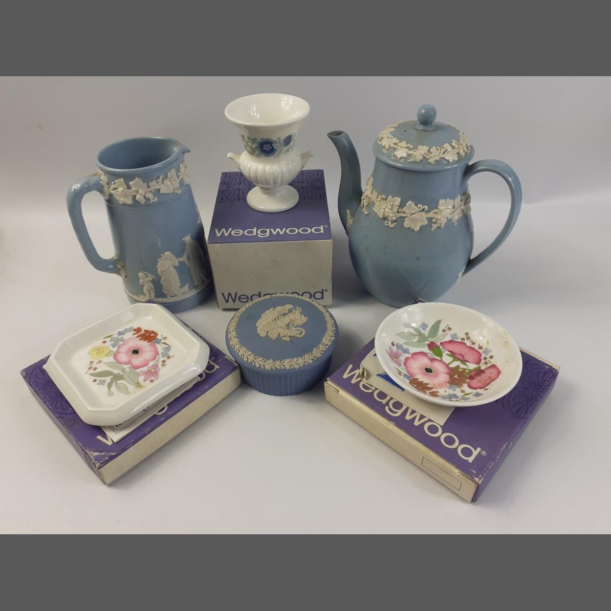 WEDGWOOD, A small collection of Wedgwood pieces to include, coffee pot 17cm approx, milk jug, and pin tray. Also two box pin trays and a boxed urn shaped vase.
