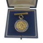 SCOTTISH JUNIOR FOOTBALL ASSOCIATION 1933 - a beautiful 14ct hallmarked gold medal presented to JAMES A LANG PRESIDENT. James was heavily involved in Scottish Youth Football throughout his life and was from Burnbank Hamilton. The medal has been consigned direct from the family. The gold medal has lovely enamelling with an embossed Lion Rampant on the obverse with inscription to reverse. Carries a later unmarked brooch bar, the medal carries full 14K hallmarks and is in lovely condition, the suspension ring is also stamped 14K. 27mm diameter and weighs approx 17.2g gross.