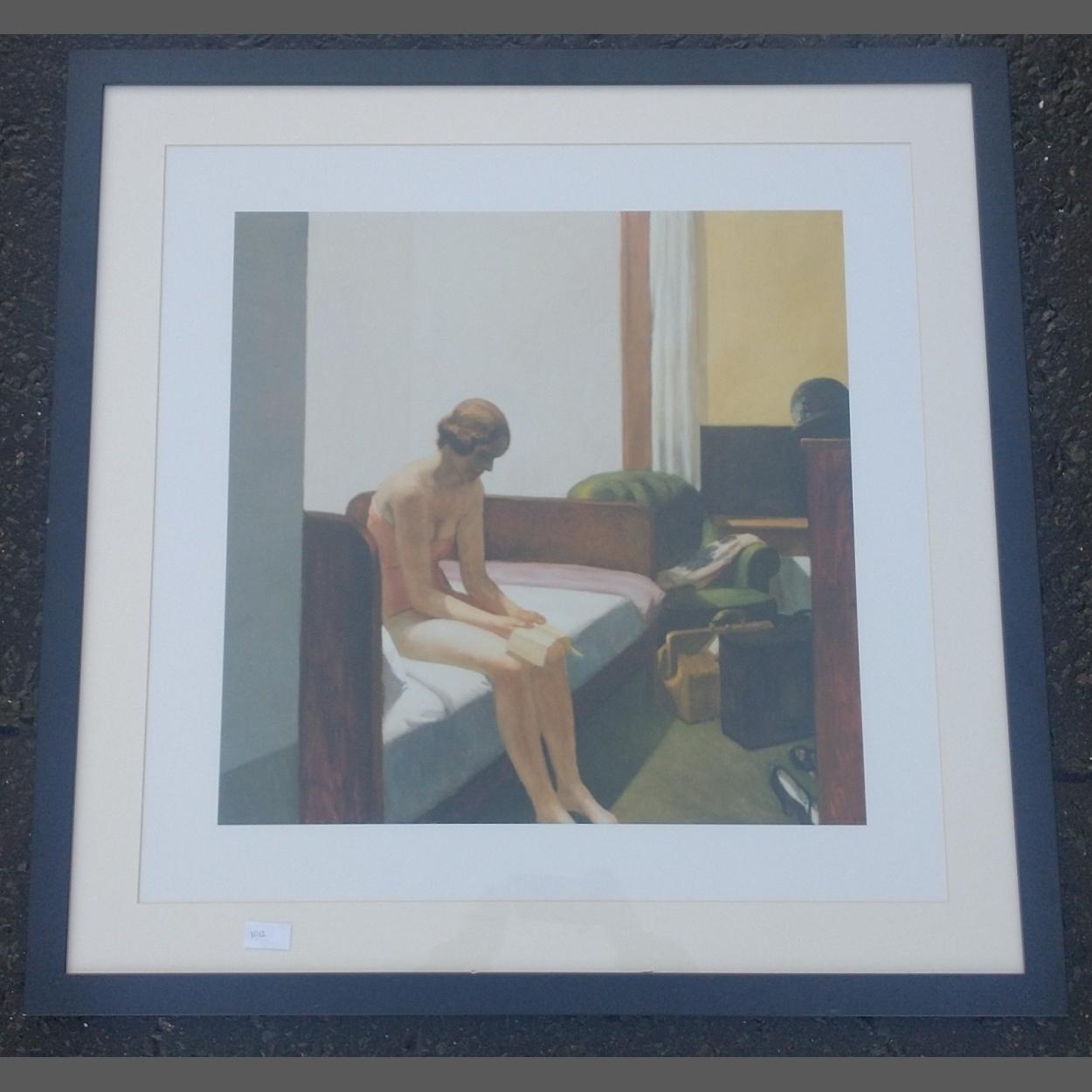 A large print of 'Hotel Room' by EDWARD HOPPER frame measures 88x88cm, visible work measures 56x 56cm