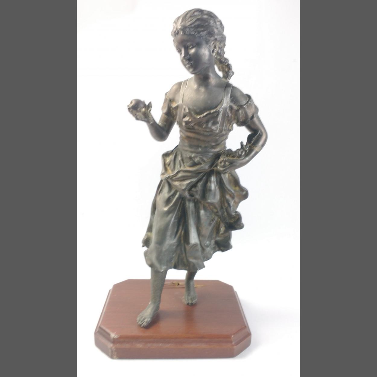 A spelter figure of a young girl with fruit, standing an impressive 47cm tall approx and in generally good condition although the base appears to have been drilled and she does stand at a slight angle. Displays well.