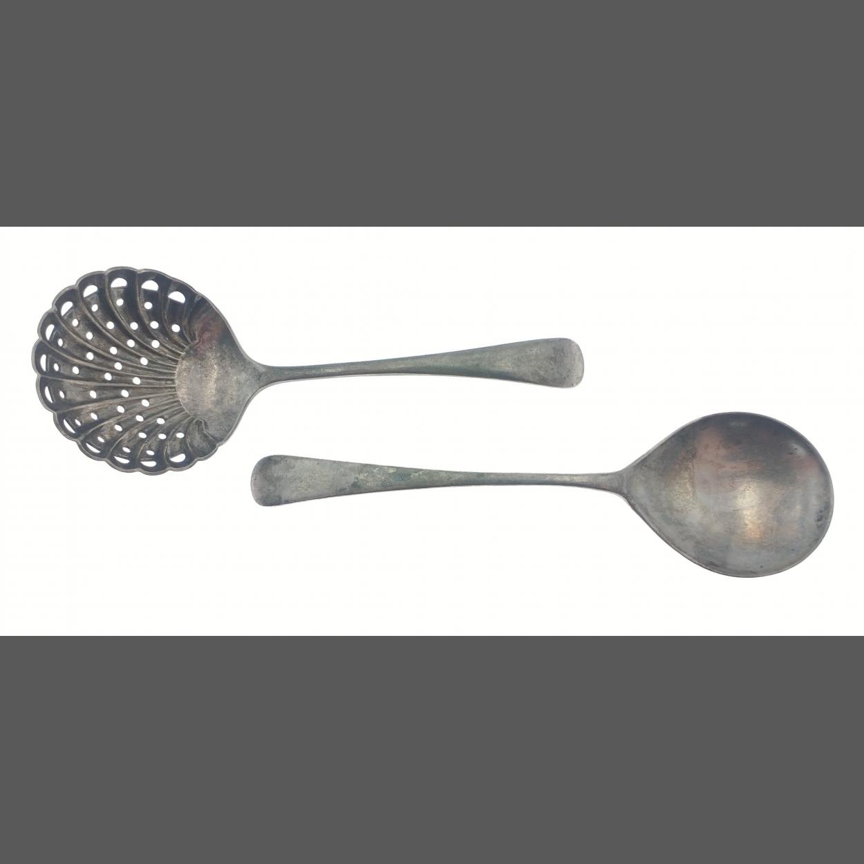 A SILVER AND SILVER PLATED SPOONS, to include a white metal sugar-sifting spoon and an antique silver teaspoon - combined weight 30.25g approx