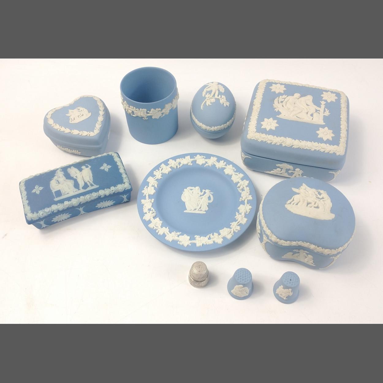 A collection of WEDGWOOD trinket boxes in various sizes including egg and heart shaped plus 2 Wedgwood thimbles and one Birmingham hallmarked silver thimble, weight 7g