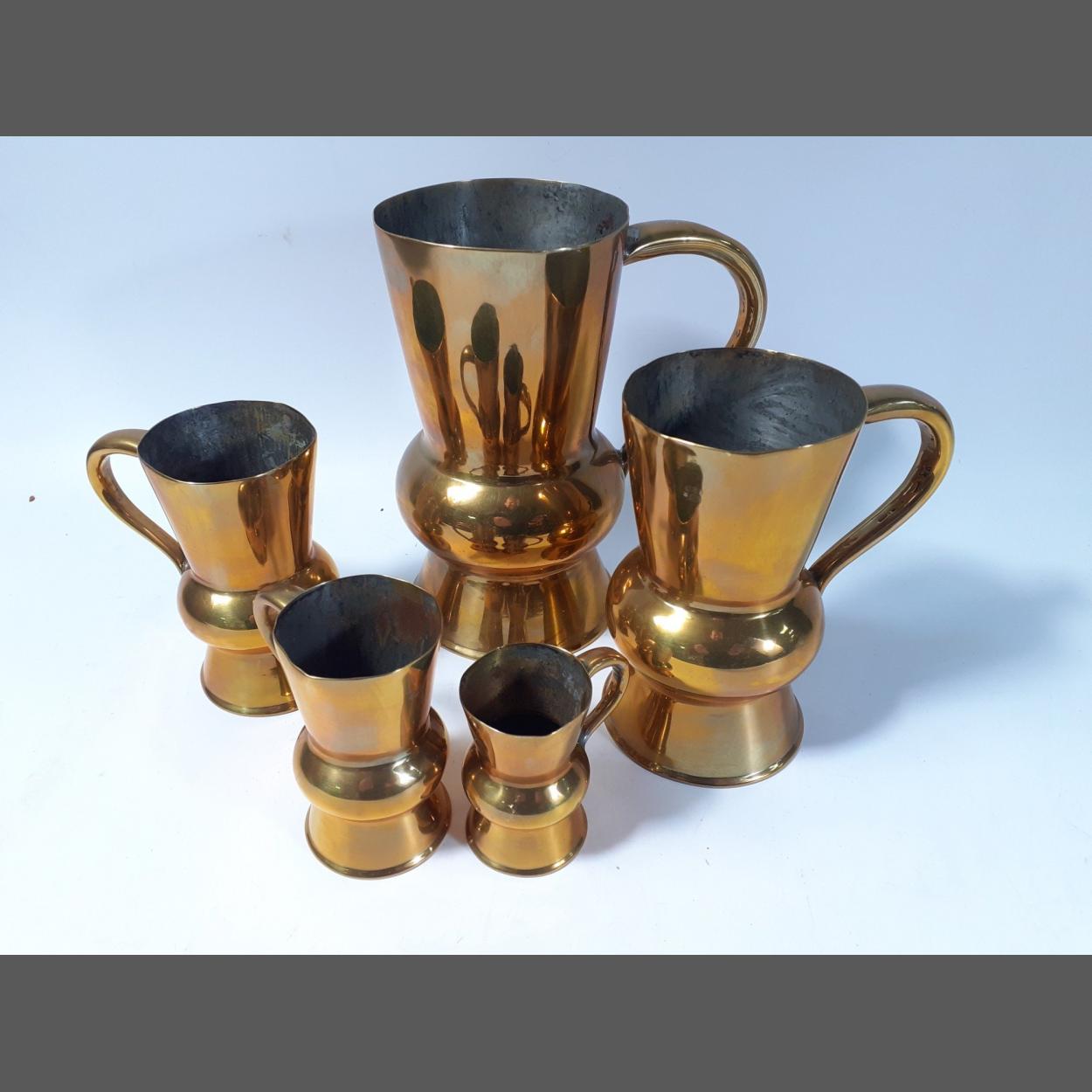 VINTAGE - A set of copper-bottomed brass spirit measuring jugs including 1 pint, 1/2 pint, 1 gill, 1/2 gill and 1/4 gill
