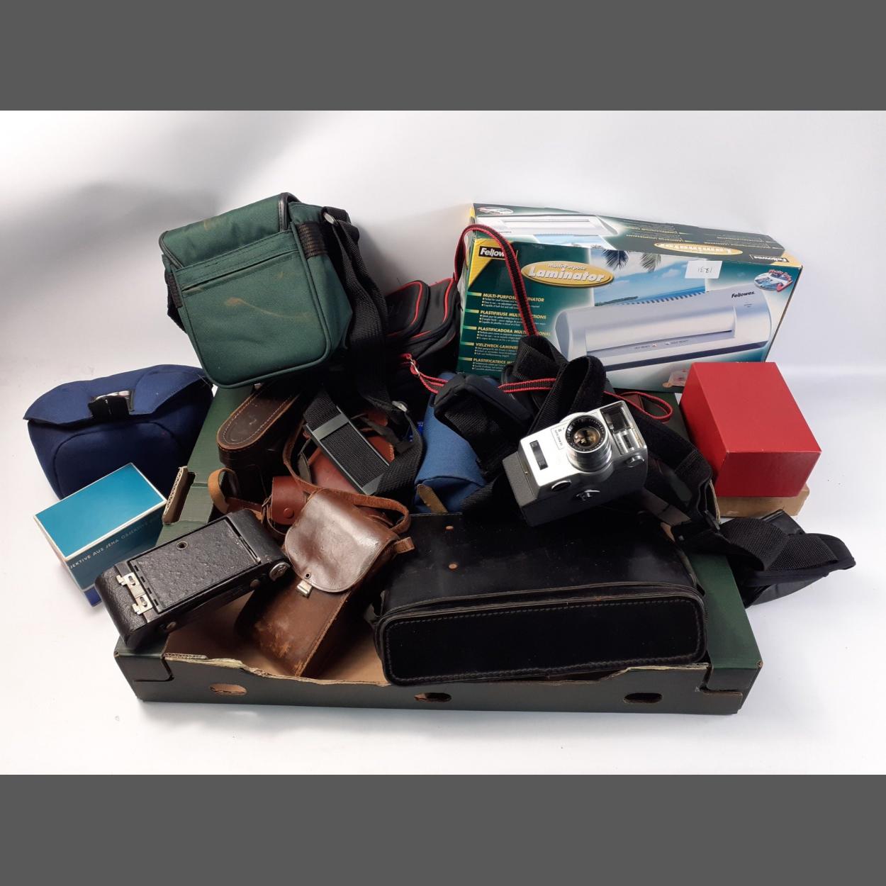 A box containing a POWERMATIC 8 movie camera, a KODAK Six 20 folding camera, a KODAK folding Autographic, a KERSHAW 63 folding camera and a number of camera cases. Lot also includes a Fellowes laminator in a box.