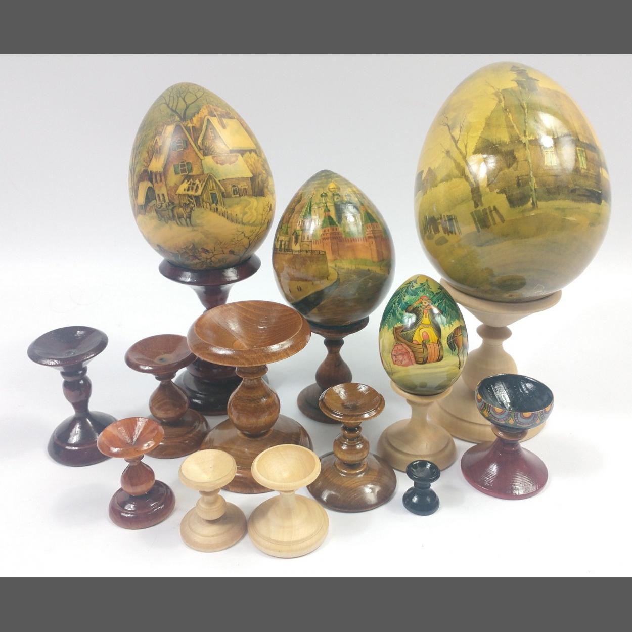 Four decorated wooden eggs in shades of sepia the tallest being approx 12cm and 8 wooden egg stands in various sizes mostly varnished.