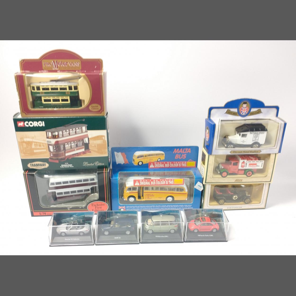 A selection of new and boxed model toy cars and busses including a MALTA BUS , a Corgi EDINBURGH TRAM , an EDINBURGH BUS , 4 MINIATURE CAR models , two by DAYS GONE BY and two others
