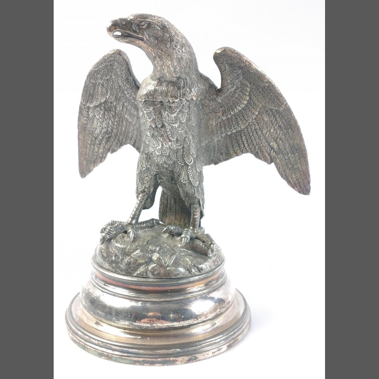 A stunning silver plated EAGLE INKWELL by JAMES DEAKIN & SONS Sheffield. Superbly well modelled figure of an Eagle sitting spread wing on rocks. Fully stamped underneath with Deakin marks. In excellent uncleaned condition, the inkwell pot is missing but would be easily replaced. Stands 20cm high approx. An attractive display model in its own right.