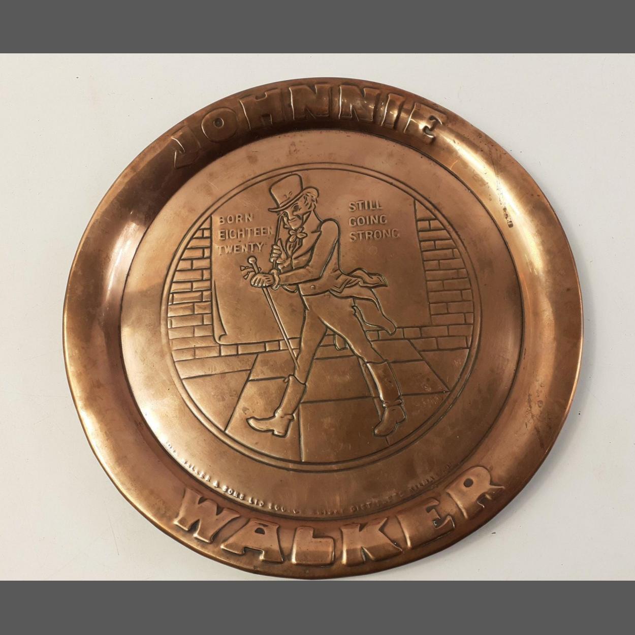 KILMARNOCK - THE HOME OF JOHNNIE WALKER, BORN 1820 AND STILL GOING STRONG! - An antique solid copper round bar tray with the outline depicting the World Famous Striding Man - dimension 34cm approx - would make an ideal talking point at parties!