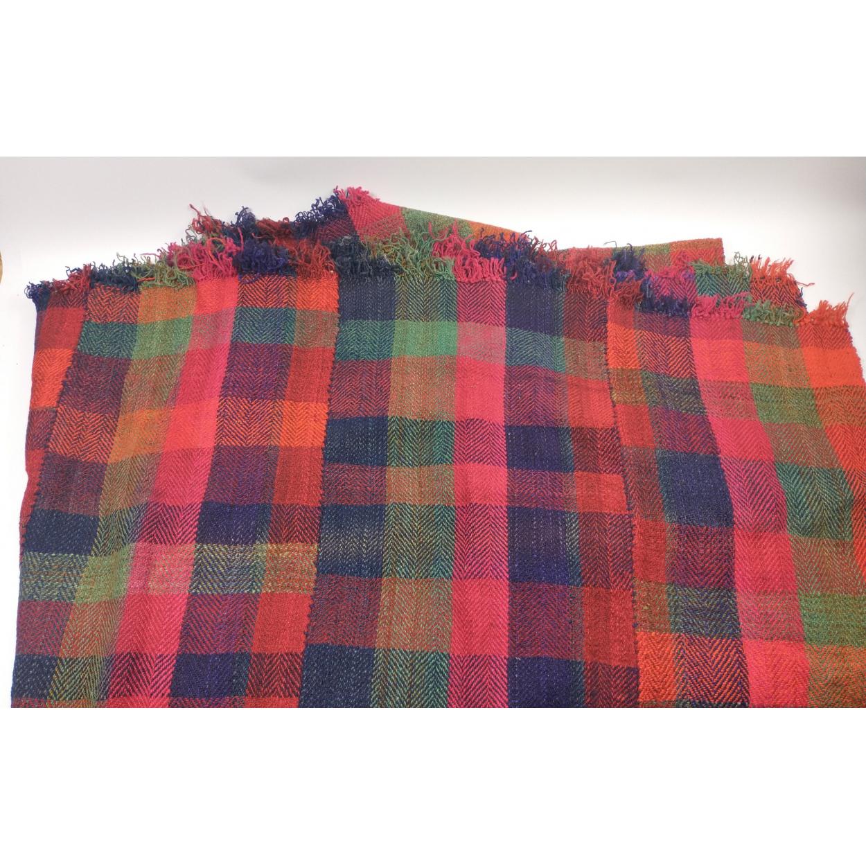 SEEING IS BELIEVING! A hand-woven woollen blanket from Kurdistan in cheerful shades of cerise and burnt orange measuring approx 75cm by 350cm. The blanket has been made in panels approx 35cm wide and then hand-sewn together, in as new condition.