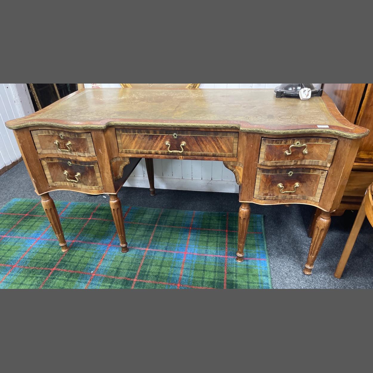 A SUBSTANTIAL antique French inspired kneehole desk with a large green distressed leather pad and brass feature trim with five generous drawers supported on eight tapered legs - dimensions 147cm wide x 77cm depth x 73cm height approx