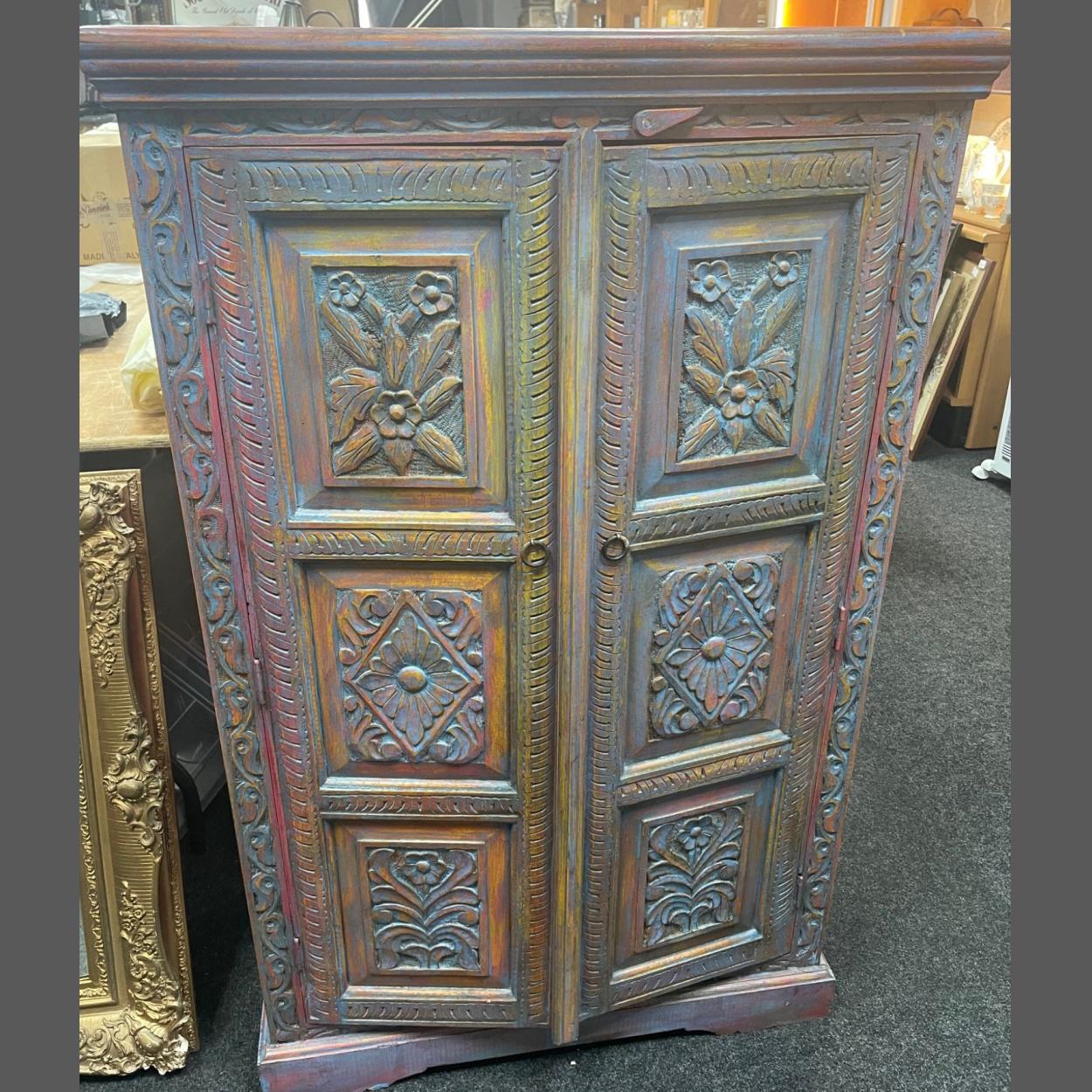 A carved Indian cupboard with 3 internal shelves in coral pink with blue accents on the front, measures H122cm x W75cm x D33cm approx