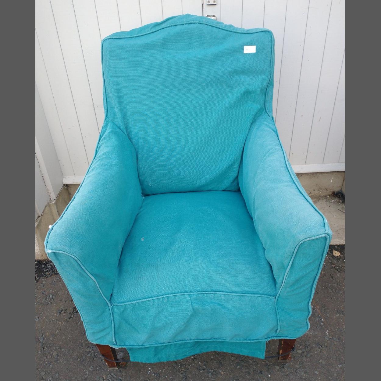 A vintage ARMCHAIR with sprung seat and blue loose covers - a really comfy wee seat!