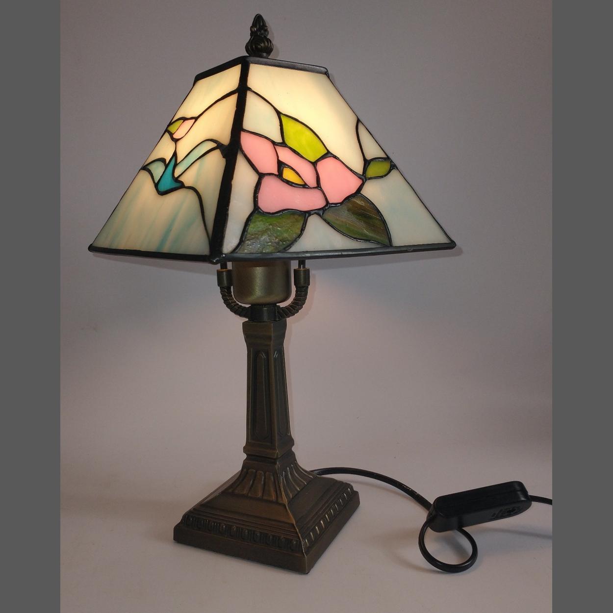 A small stained-glass table lamp with bronzed stem standing approx 36cm