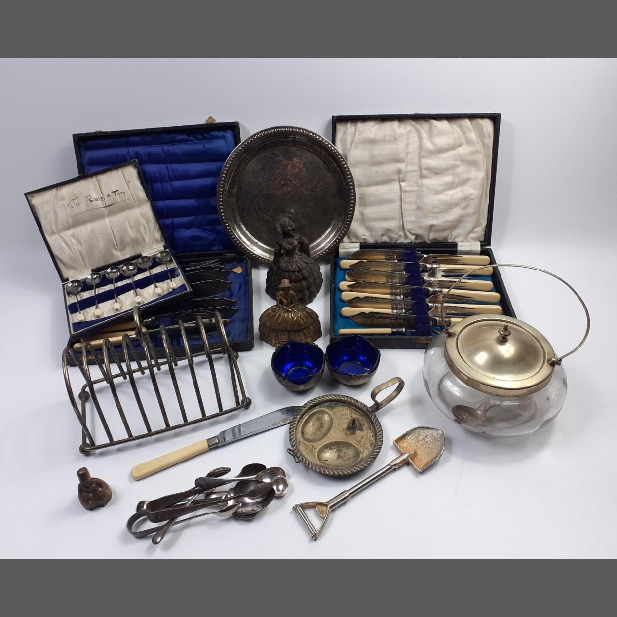 A box of mainly EPNS items to include boxed fish forks and knives, toast rack, a tray (21cm dia approx), a box of 6 coffee bean spoons, 2 condiment dishes with blue glass liners (6.6cm dia), a boiled egg dish, 2 brass bells disguised as crinolined ladies