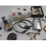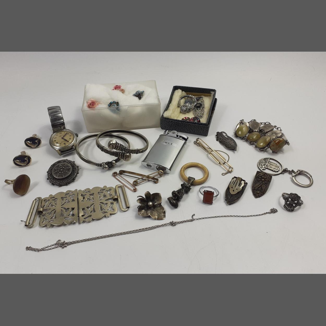 A mixed bag of silver plate and white metal jewellery to include a nurse's buckle, a pair of collar clips, 2 bangles, a marcasite ring (size M), a polished stone bracelet, plus various brooches, rings etc