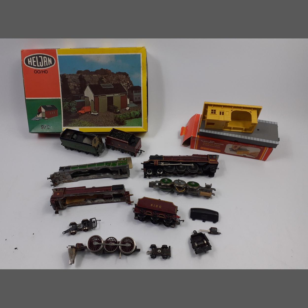 A Heljan 00/HO AH7 building set, and a Hornby Railways R510 Platform Shelter and assorted die cast rolling stock and locomotives. The locos are high quality metal but are partly disassembled.