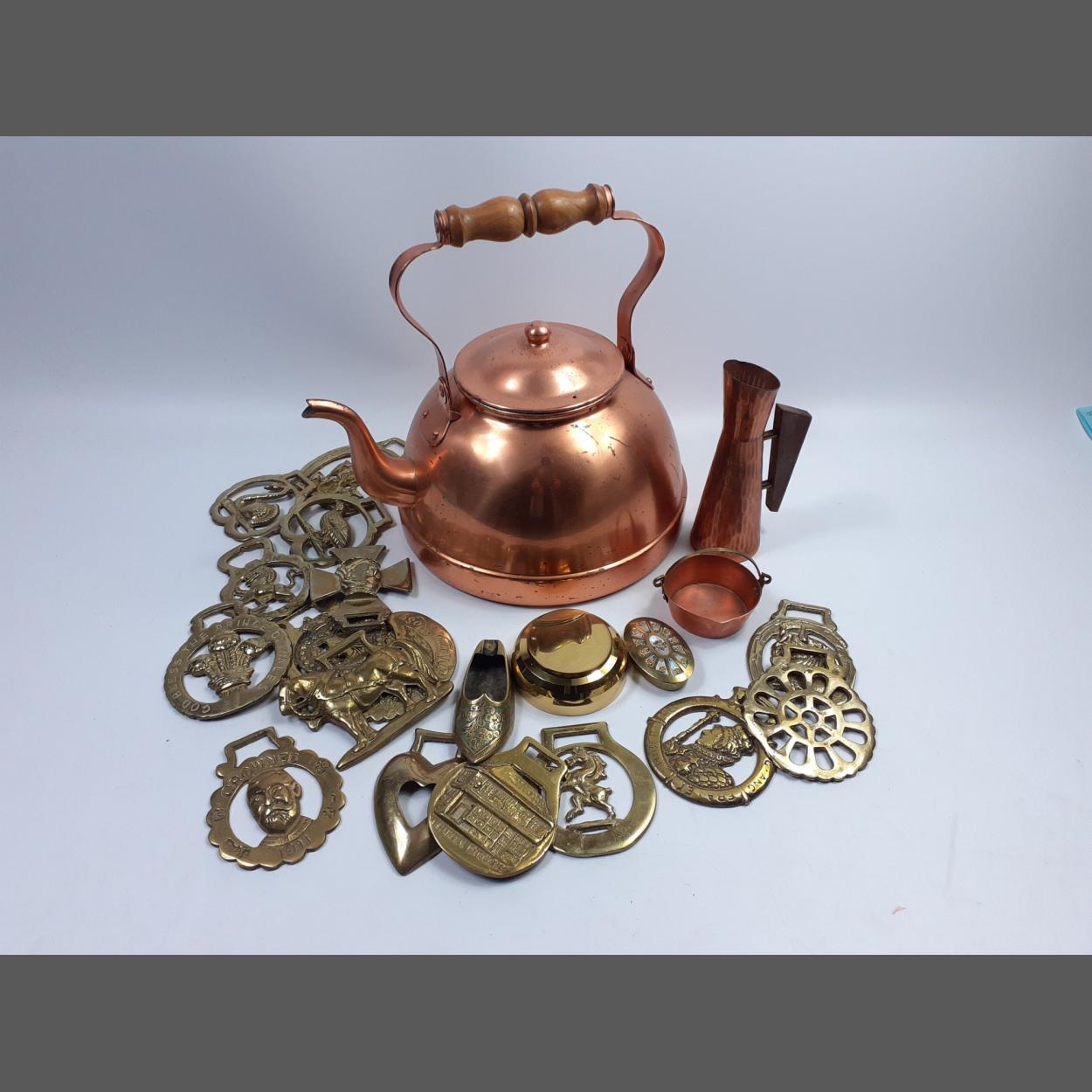 A mixed brass and copper lot to include 16 horse brasses, a heavyweight small clock paperweight (face 3cm approx),a small copper jug, a copper kettle etc
