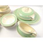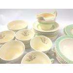 A part NEWHALL tea set to include 6 teacups, 6 saucers, 6 side plates, a milk jug and sugar bowl plus some Burleigh Ware including 6 bowls (15cm dia), a sauceboat with underplate, 2 ashets (31 and 35cm approx) and an Art Deco style lidded casserole dish (18cm dia)