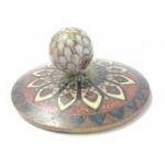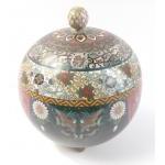 A large cloisonne bowl with lid decorated with stylised dragons and birds of paradise stands approx 19cm H 20cm diameter approx, standing on 3 feet, the finial has been damage repaired but not noticeable without looking closely!