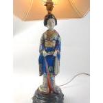 A rather attractive Geisha style Oriental lady ornament presented as a lamp. A very pretty ceramic model standing 40cm approx excluding shade. The head has been off and reattached which is visible but does not detract from the overall appeal