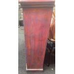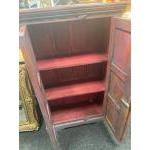 A carved Indian cupboard with 3 internal shelves in coral pink with blue accents on the front, measures H122cm x W75cm x D33cm approx