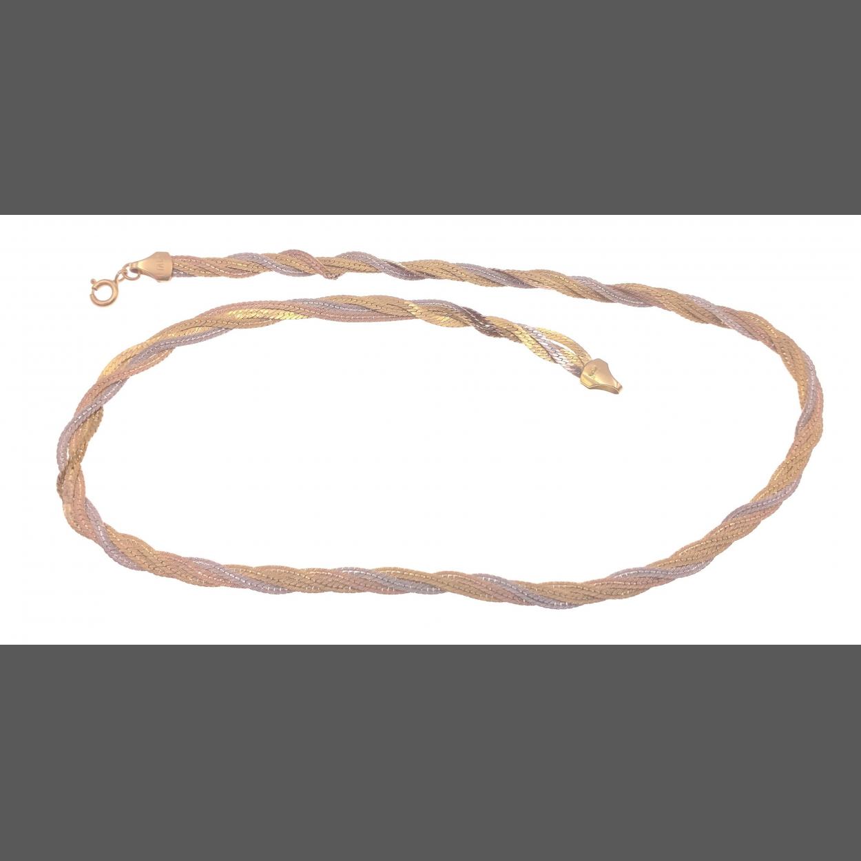 A beautiful three colour flat twist 18ct GOLD necklace. Carries full marks for Italy and 750 gold purity stamp. Slight damage to one of the threads, only visible from one side. Total length 45cm. Total gross weight 14.4g approx.