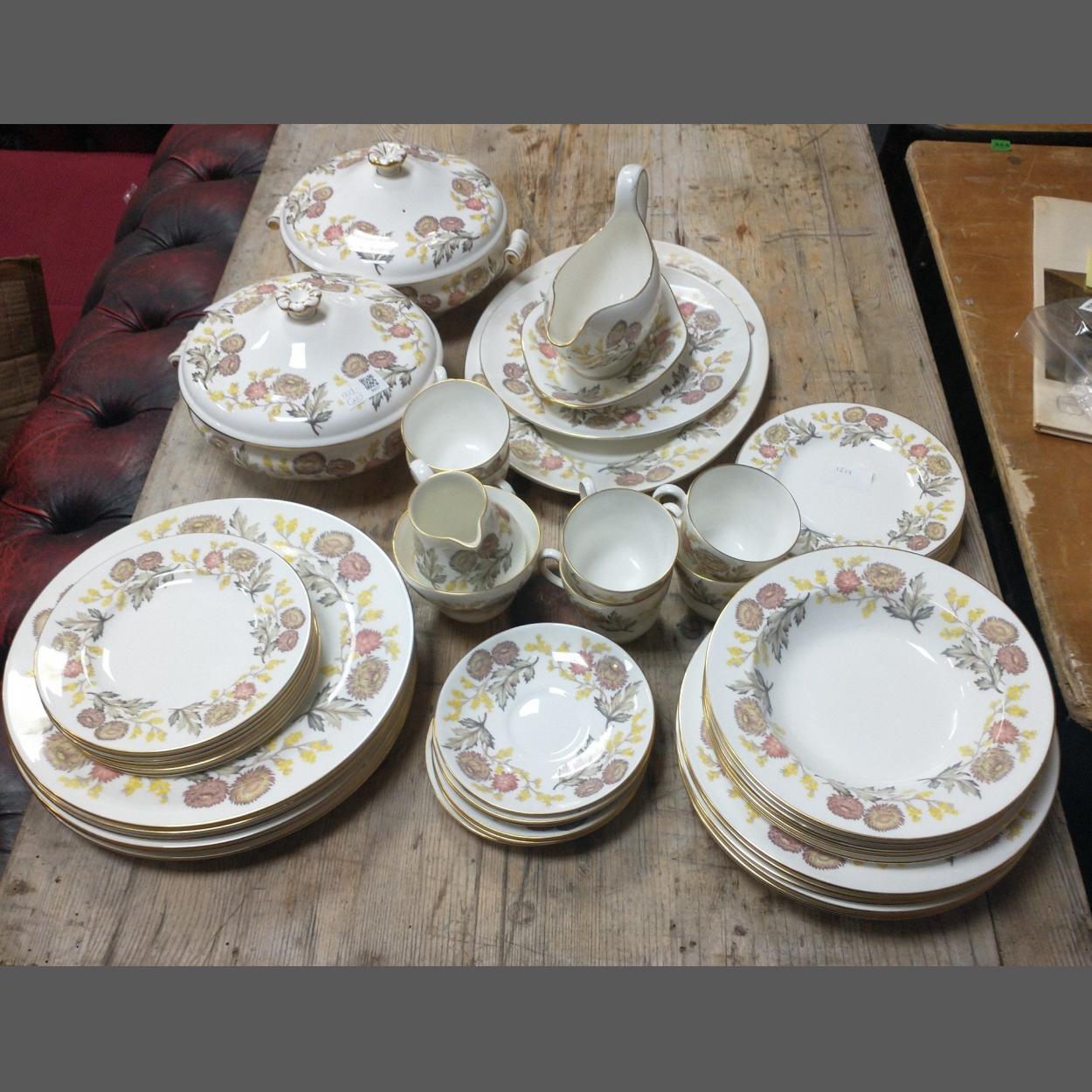 A WEDGWOOD LICHFIELD pattern dinner service to include 6 cups, 6 saucers, 12 plates (18cm), 1 plate (24 cm), 6 plates (27cm), 6 bowls (20cm), 6 bowls (23cm), 1 sauceboat with underplate, 1 ashet (35cm long), 2 covered serving dishes (20cm, 1 has a crack in the lid), 1 milk jug, 1 sugar bowl