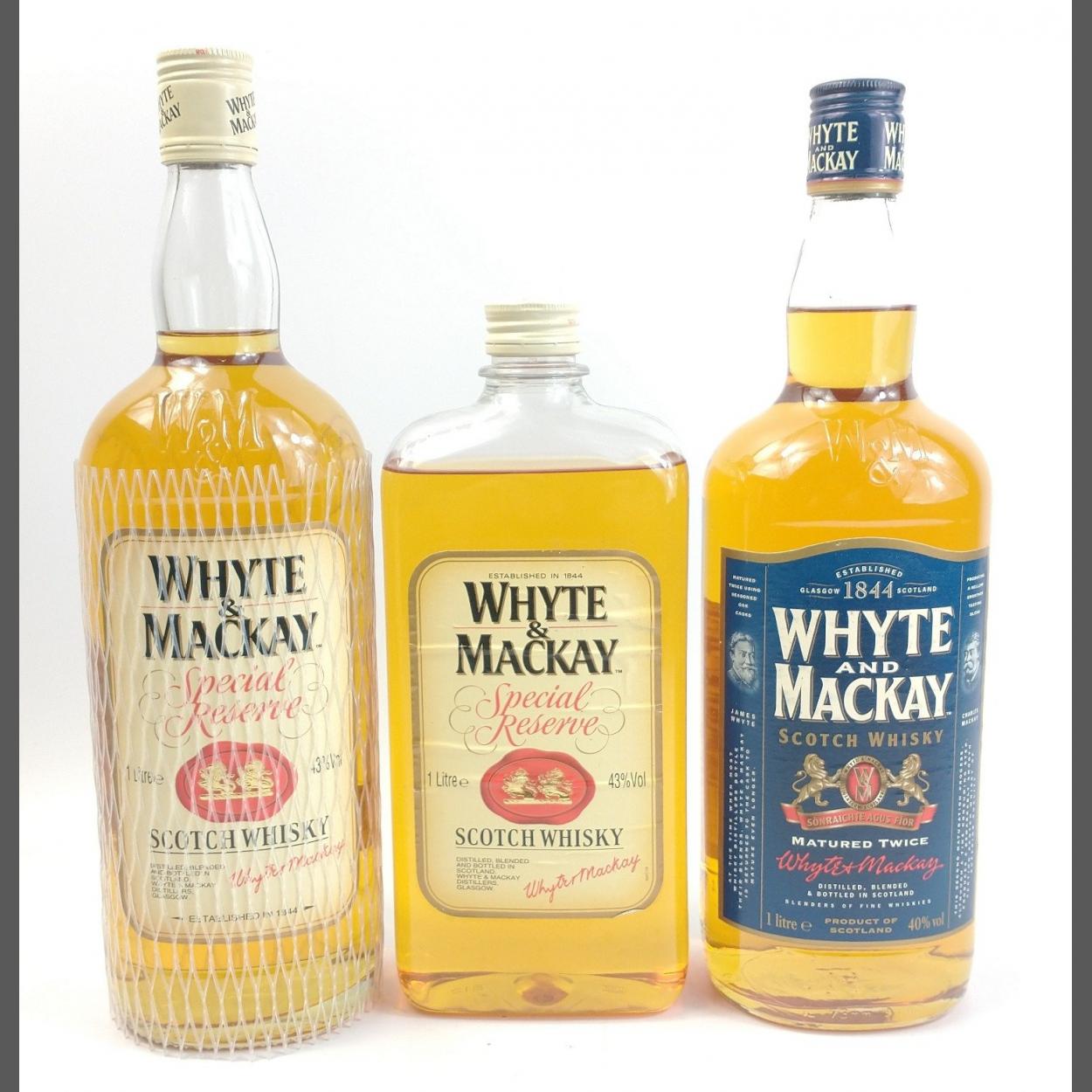 Two one litre bottles of WHYTE & MACKAY SPECIAL RESERVE blended whisky (one in plastic bottle) (5010196001922) and a 1 litre matured twice bottle of WHYTE & MACKAY (5010196065047)