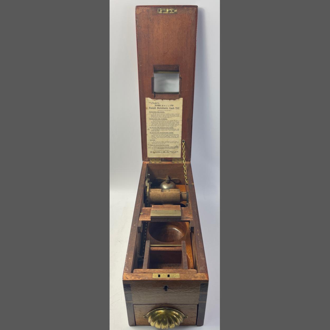 A 19th century GLEDHILL and SONS mahogany patent automatic cash till, no 21814, with a pull out lower shelf with sectional drawer, instructions for using the registration paper are attached to the inner lid, 44x16x18cm