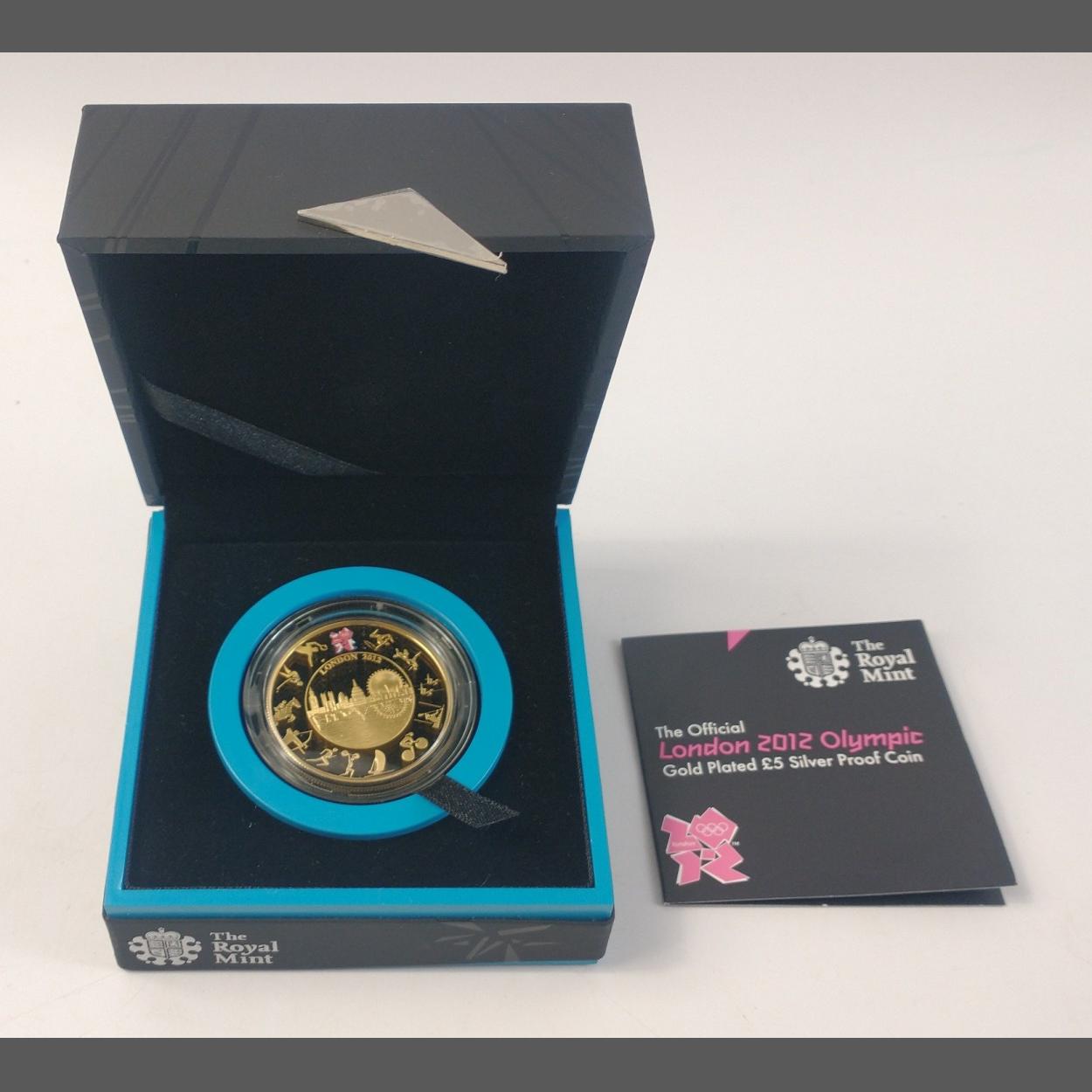 From the Royal Mint - the official LONDON 2012 OLYMPIC Gold Plated £5 silver proof coin, cased weight 28.28g