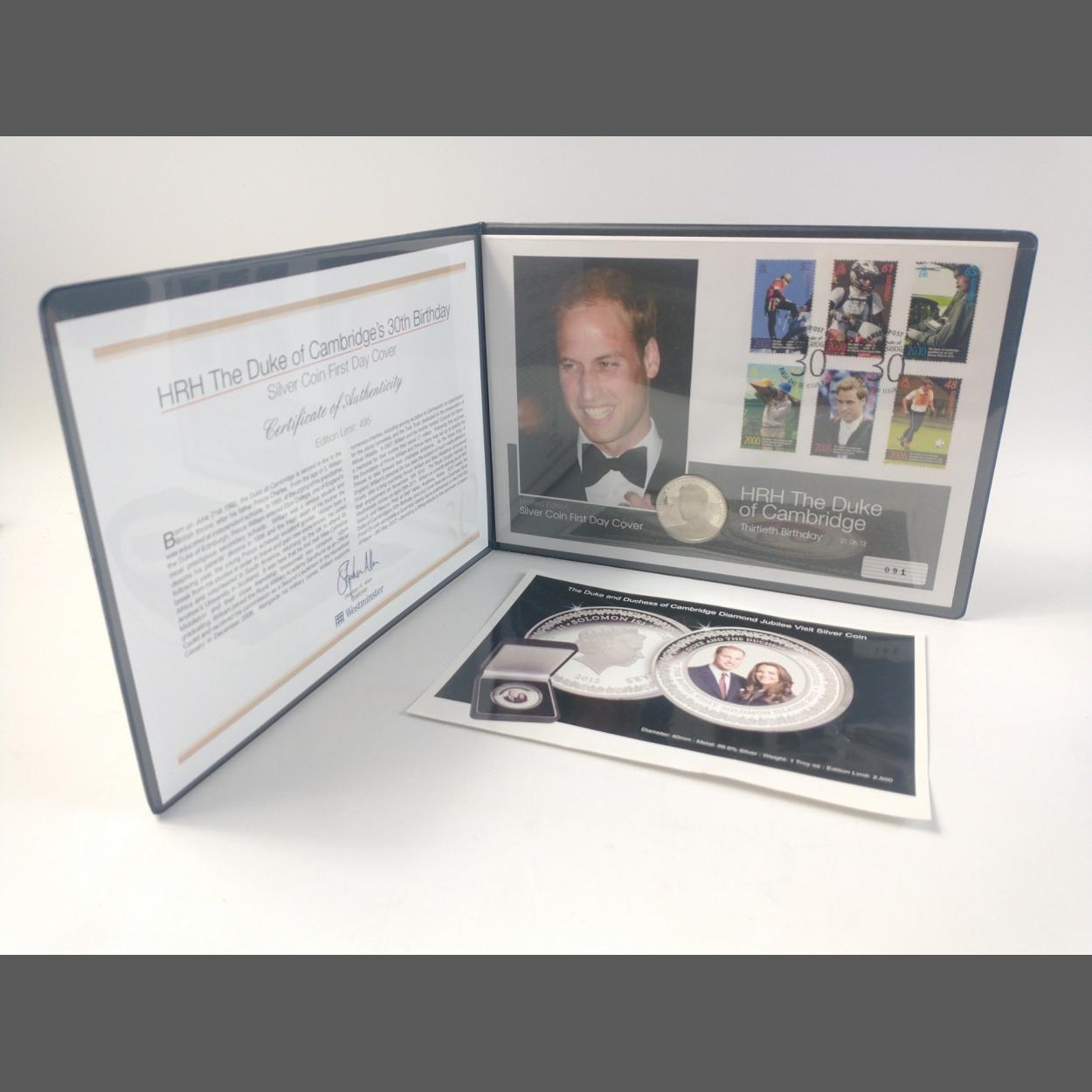 A silver coin first day cover celebrating the Duke of Cambridge's 30th birthday, a limited edition no 91 of 495, in presentation pack with certificate of authenticity