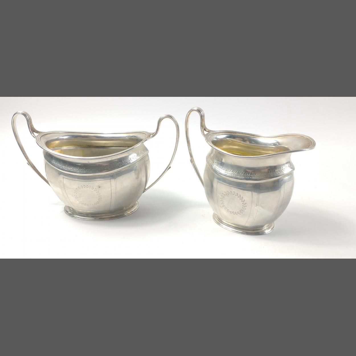 A hallmarked silver, Birmingham 1919, milk jug and sugar bowl by ELKINGTON with laurel wreath decoration, weight 480g approx