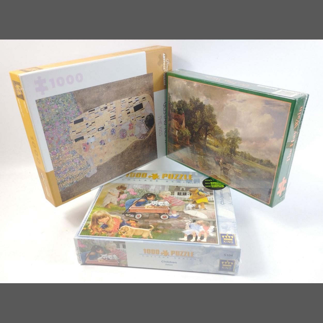 Three unopened jigsaw puzzles each 1000 pieces to include Klimt's 'The Kiss', The Hay Wain, and Children