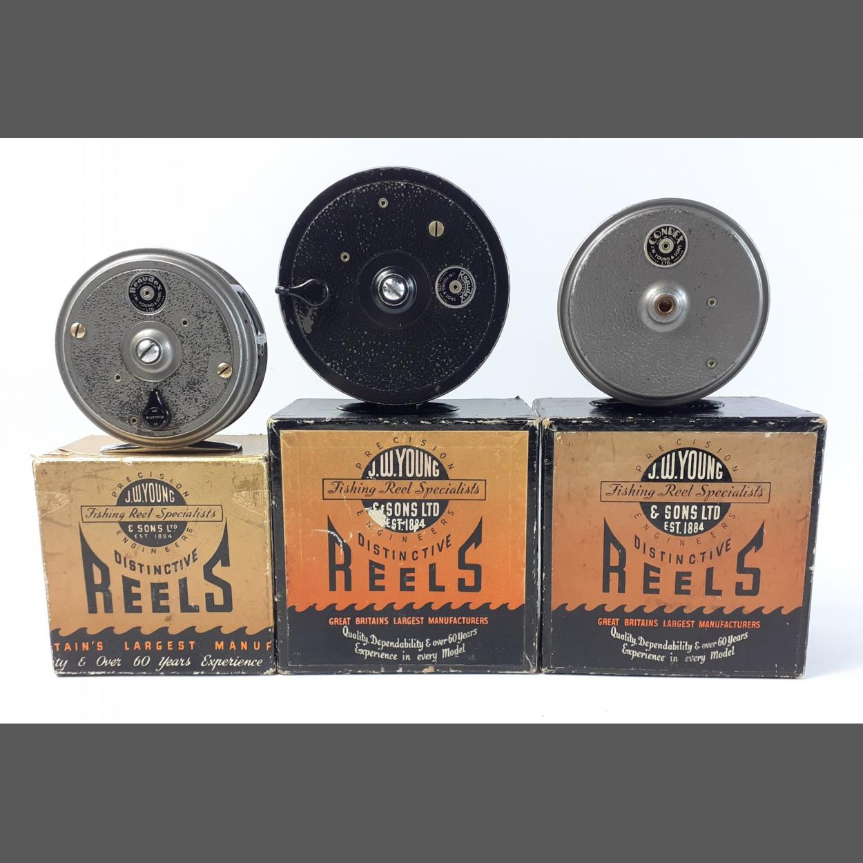 Three JW YOUNG trout reels in original boxes including THE CONDEX 3 1/2" medium width, THE RAPIDEX 4" and a BEAUDEX 3 1/2"