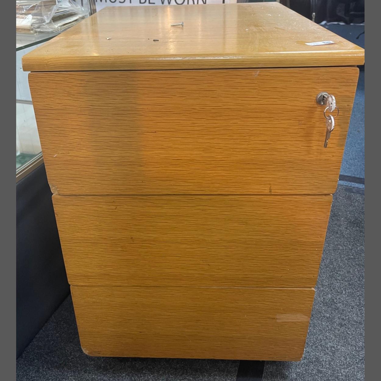 A neat three drawer office set of drawers with keys measuring 58x43x44cm approx