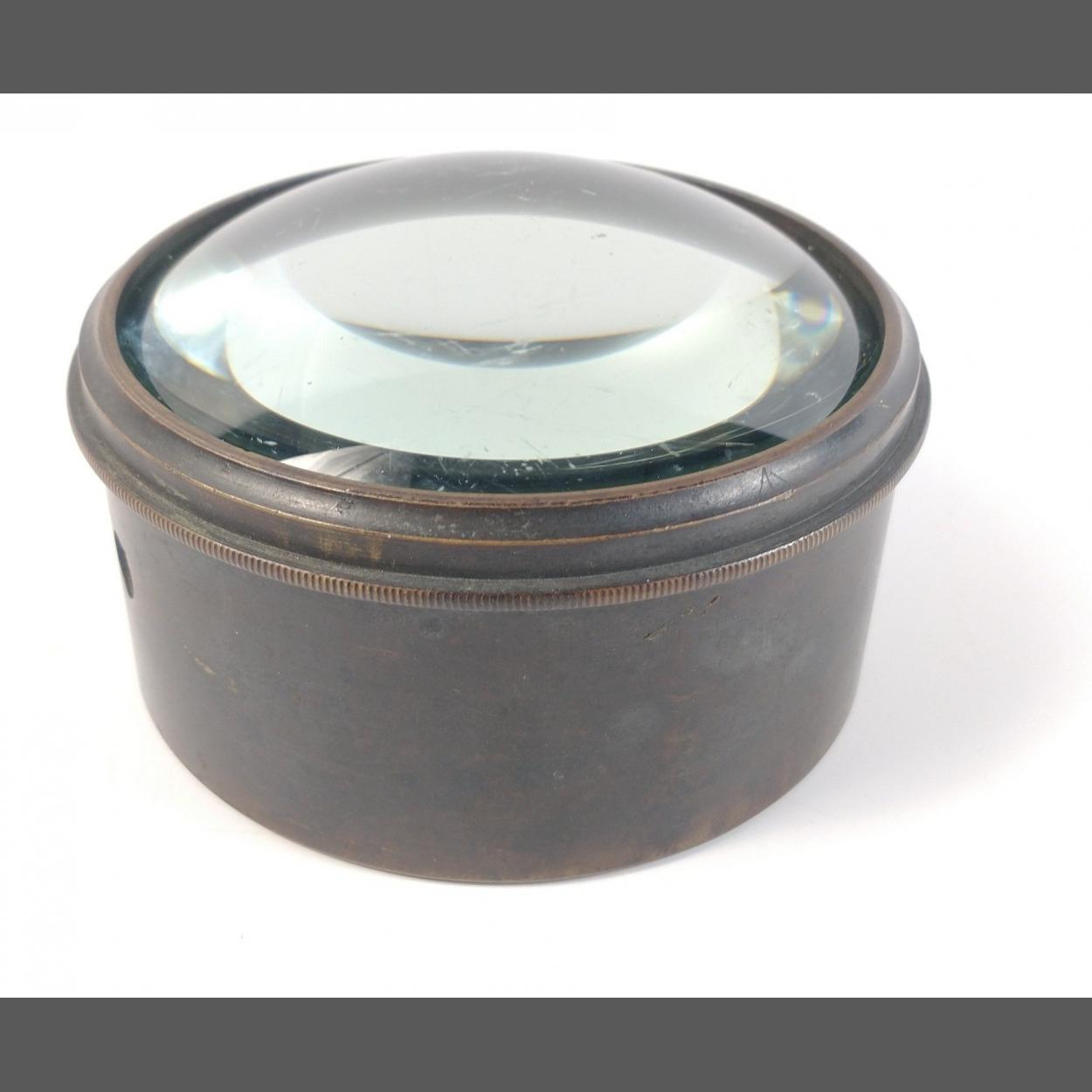 A super large Victorian magnifying brass lens which has two retaining holes either side. Lens has a few minor scratches but overall a nice useable big lens. Lens measures 10cm across.